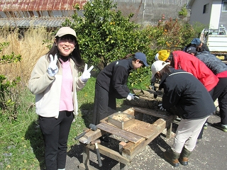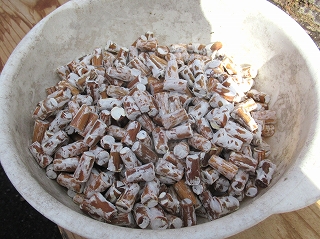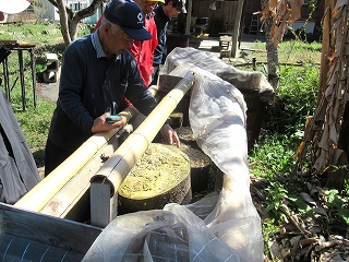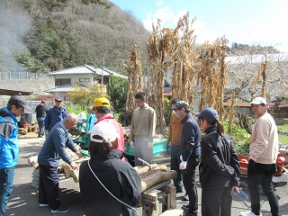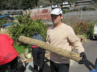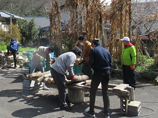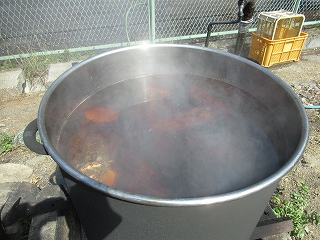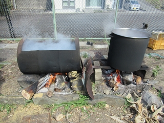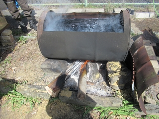 みんなで作業をしていると、横で地元の方が何かをしています。 これ、何をしていると思いますか? これ、舞茸(まいたけ)の原木を煮沸消毒しているんだそうです。 |