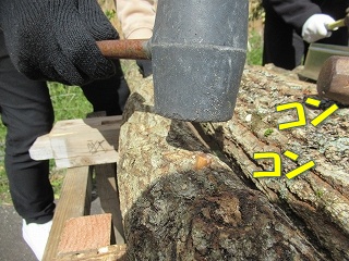 あいた穴に種駒を差し込み、ハンマーを使って原木に押し込みます。 いしかわさん、普段の仕事でもハンマーを使うことがあるので、ハンマーの取り扱いはお手のもの! |
