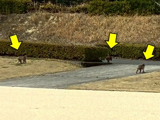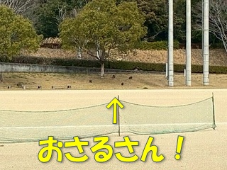 すると・・・ 野球場でなにやら「うごめく集団」が! よく見ると「おさるさん」の集団です! こんな人里まで下りてくるんですね。 |