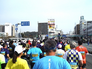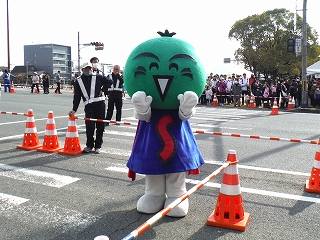 そしてスタート! 右手に知事や市長、ゲストの方々を見ながらスタートしていきます。 徳島県民のアイドル、すだちくん発見! これから42キロの長旅です。 いつもは走れない、国道11号線のど真ん中を走るのは気持ちいい! |