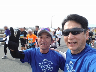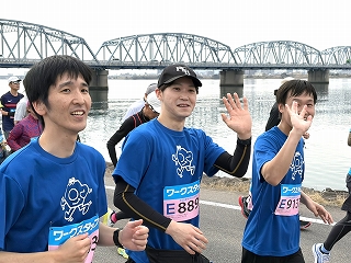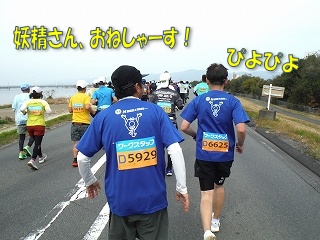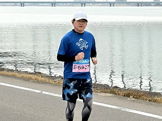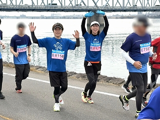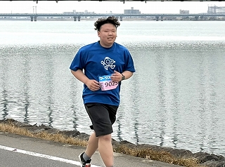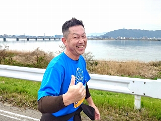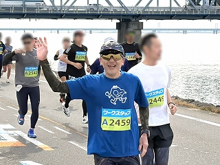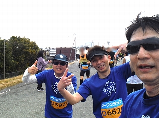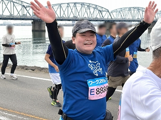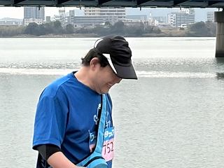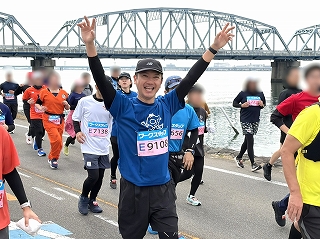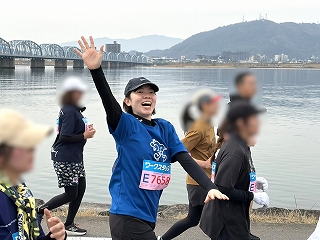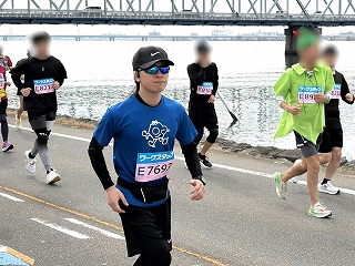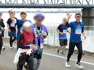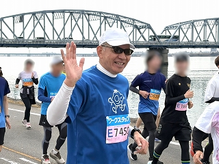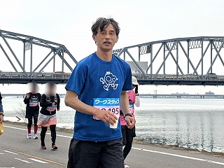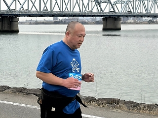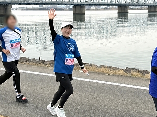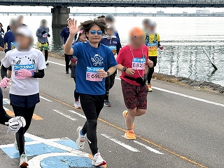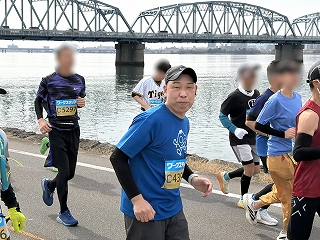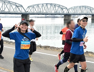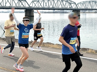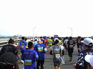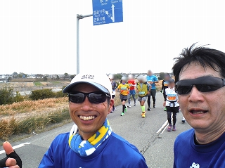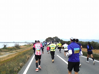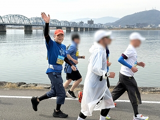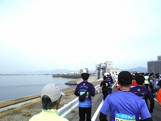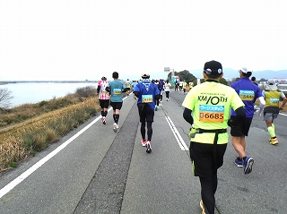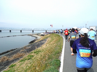 ランナーたちは吉野川大橋を渡り、北岸へ。 前半は吉野川北岸をひたすら西へと向かいます。 ええ、約20キロ、ず~っと川沿いです。 |