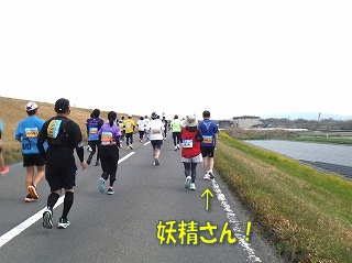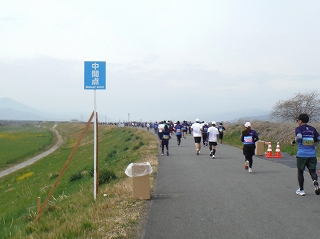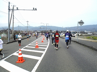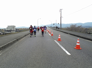 レース後半となる吉野川南岸は、色々な集団が形成されます。 フルマラソンは「30キロ」からが本番なのです。 |