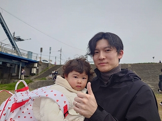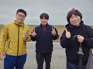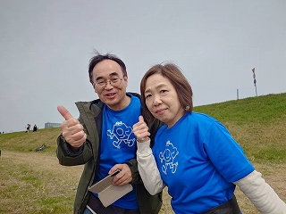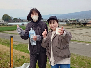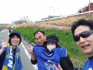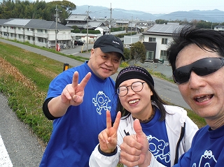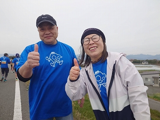 ←吉野川橋の下から駆け上がると、OBのいがさんが応援してくれていました! ↓北岸堤防では、くすもとさんがお子さんと応援してくれました! 少し先では、たけやまさんとかわのさんが二人並んで応援してくれました! |