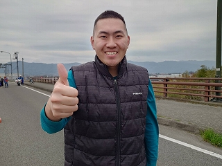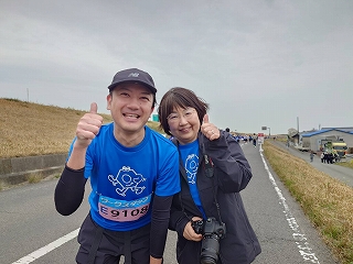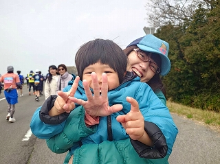 ←スタート直後でバルーンを持って応援してくれた、おのさん! ↓吉野川橋の下では、おおくらさんがお子さんと一緒に応援してくれました! はまださんとよしみねさんは、同じく吉野川橋の下で、ランナーたちの写真をたっぷり撮影してくれました! ありがとうございます! |