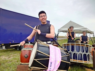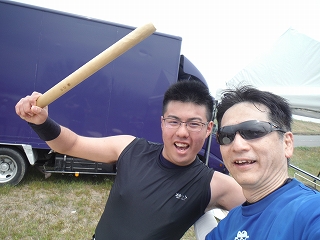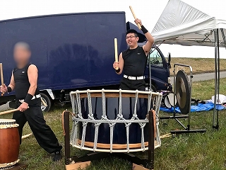 演奏途中だったにも関わらず、太鼓を叩くのを止めてWと写真を撮ってくれました! たけだくんと写真を撮るために、約30センチの段差をなかなか上がれないヘロヘロのW(汗) |