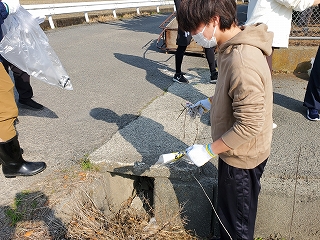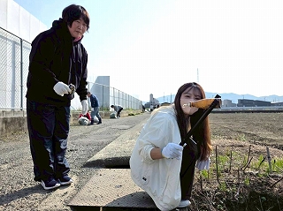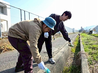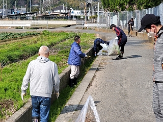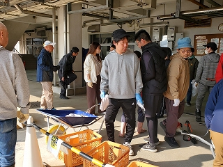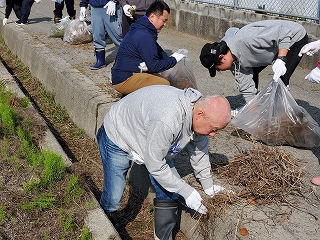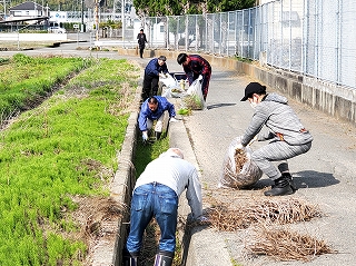最初は「側溝の中のゴミだけ回収しよう」だったのですが、「せっかくなので、全部浚っちゃえ!」と、堆積した枯草なんかも掻き出すことに! そうと決まれば行動は早い! みんなでガンガン搔き出していきます。 |