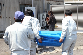 楽しい時間はあっという間に過ぎちゃいます。 集合写真を撮るために、ブルーシートを除けましょう! 実はブルーシートを敷いたまま写真を撮ると、みんなの顔色が真っ青になっちゃうんです(笑) |