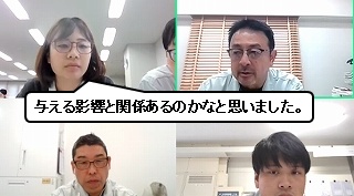 くめちゃんは、 「文章を書く時に、『認知』や『他者の視点』までは書くことが出来ていなかった。この2つは与える影響と関係があるのかなと感じました」 とのことでした。 |